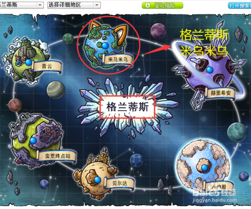 尖耳狐狸村在格兰蒂斯宿世界,我们在地图上选择格兰蒂斯界面,图上这个名为米乌米乌有尖尖狐狸耳朵的星球就是。