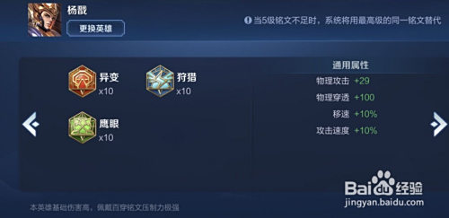 起首,铭文选择:异变*10,打猎*10,鹰眼*10,提高线上压制能力。