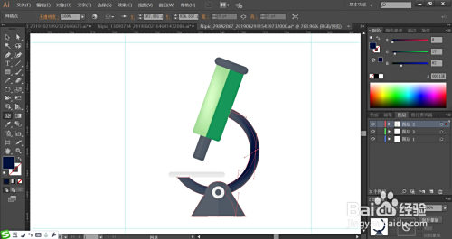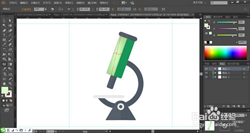 利用明暗两种绿色填充显微镜的本家儿体路径,左侧为亮光结果,再用蓝黑色填充显微镜的的顶端与圆弧的布局件。