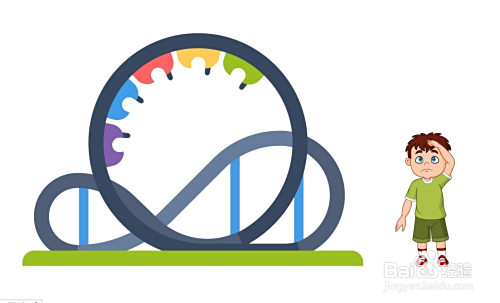过山车上面的座椅用紫、蓝、红、黄、绿等五色进行填充,过山车右侧的小孩的衣服也用草绿色填充。