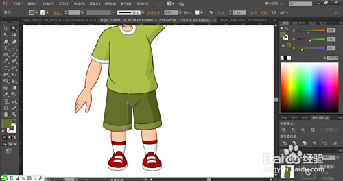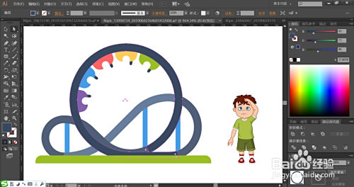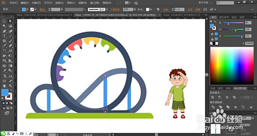 小孩的短裤用深绿色填充,鞋子用红色与白色搭配填充,袜子也是红白色的结果,完当作过山车图片设计。