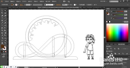 利用钢笔绘制出过山车的根基轮廓,再用钢笔勾勒出过山车上面的座椅,右侧的小孩子的动作与脸色的细节路径。