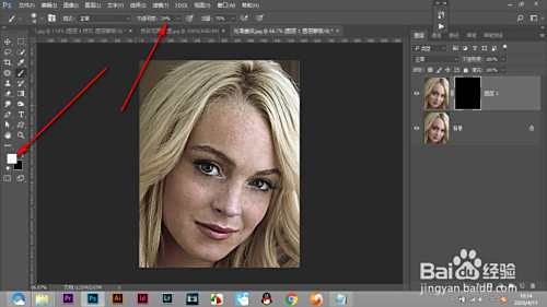 6.下面将前景色切换白色,将画笔的硬度,不透明度降低。