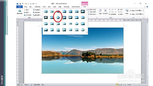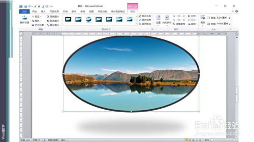点击图片,激活图片东西。选择图片东西——照片样式组,已有样式中的棱台型椭圆,黑色。