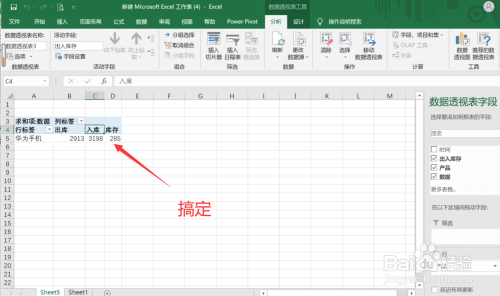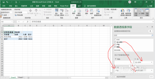 第三步:将【收支库存】拖到【列】、【产物】拖到【行】、【数目】拖到【值】