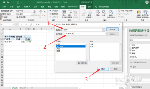 第六步:在【名称】右侧输入:库存 ,在【公式】右侧输入=入库-出库 。最后点击【确定】