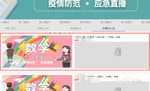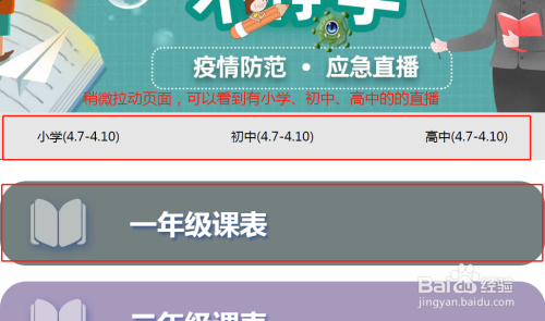 稍微拉动页面,可以看到有小学、初中、高中的直播,这里我们点击一年级课表;