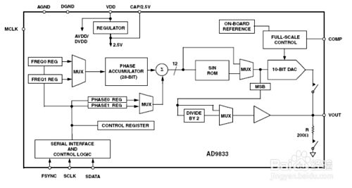 AD9833的内部电路本家儿要稀有控振荡器(NCO)、频率和相位调节器、Sine ROM、数模转换器(DAC)、电压调整器,其功能框图如下图所示。