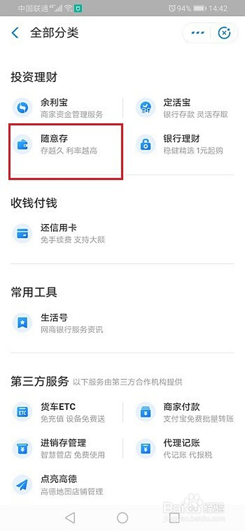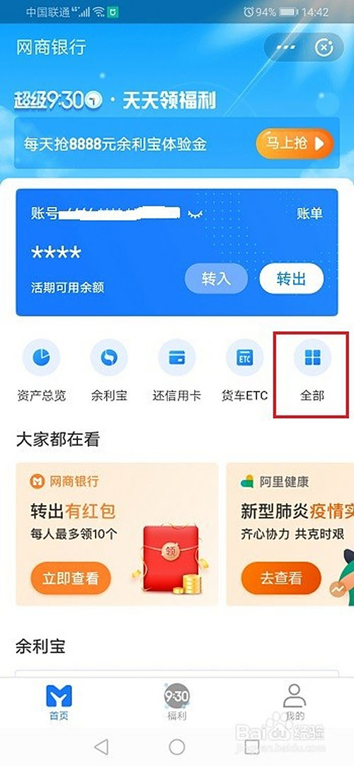第一步打开支付宝,在我的界面,点击网商银行,进去之后,点击全数,如下图所示: