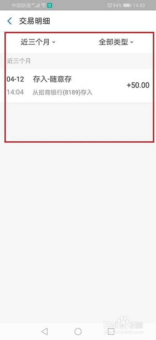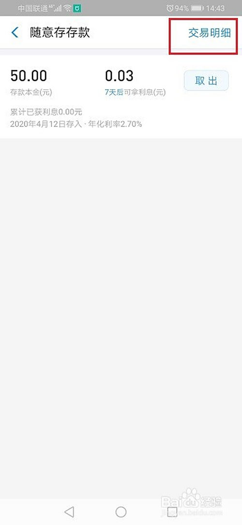第五步进去之后,可以看到随意存的买卖明细记实,按照需要查看,如下图所示: