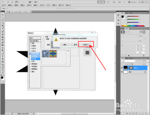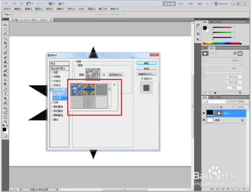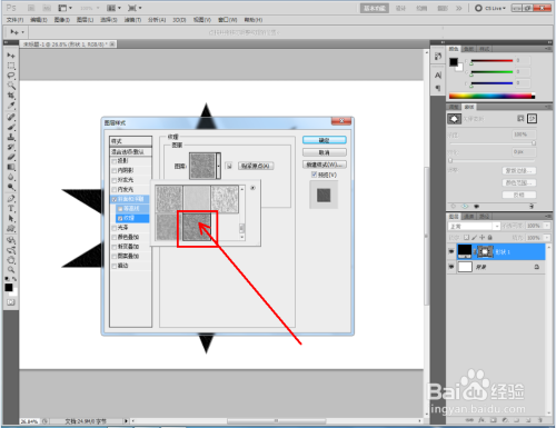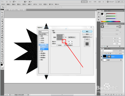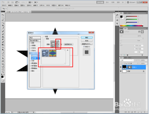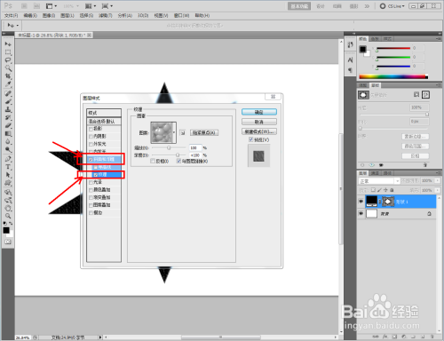 双击图示自界说图案图层,弹出图层样式设置栏。勾选【斜面和浮雕】-【纹理】,点击图示小三角,弹出图案选项栏;