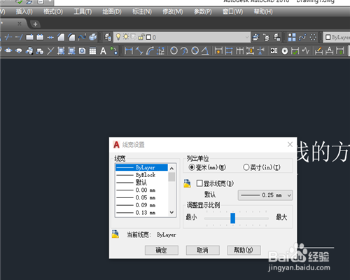 除了以上这种方式,常规还有一种先将线型宽度设置好的方式,点菜单栏上的格局,找到里面的线宽,点击呈现如图的窗口,就可以设置了,这里就不再具体介绍了。