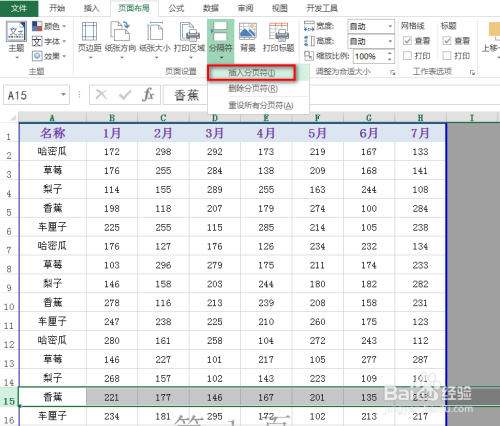 接着,在“页面结构”选项卡下找到并点击“分隔符”下的“插入分页符”,具体如图所示: