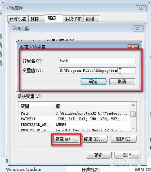 点击新建,名称为Path路径为D:\Program Files\ffmpeg\bin