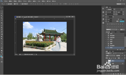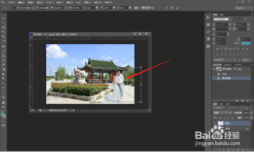 第四步; 将人物移动到布景 图层上,而且调准人物巨细比例;合适位置。看图