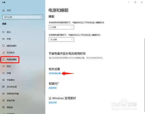 4.选择左边菜单电源和睡眠,点击其他电源设置