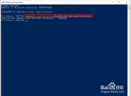 2.输入以下指令powercfg -duplicatescheme e9a42b02-d5df-448d-aa00-03f14749eb61回车