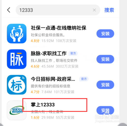 第一:应用商铺搜刮【掌上12333】然后下载安装。
