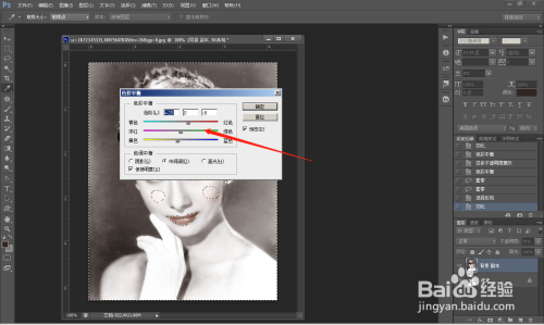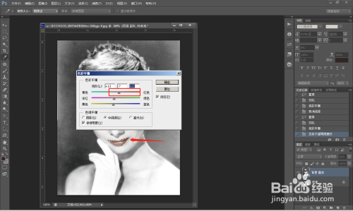 第六步:在对人物嘴唇做选区成仙1.5像素为宜,操纵色彩均衡上色;看图解