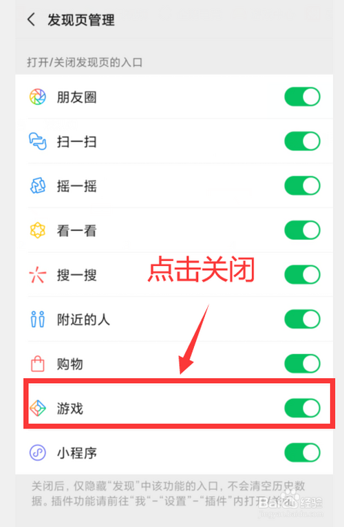 在弹出的页面中选择游戏功能,点击封闭即可,回到发现页将看不到游戏功能。