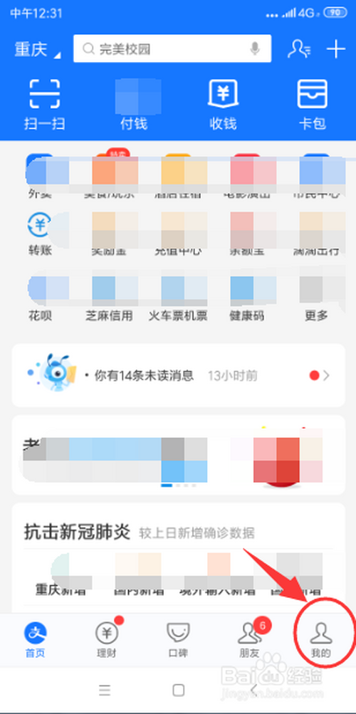 解锁手机进入支付宝后,如图,先点击右下角“我”按钮。