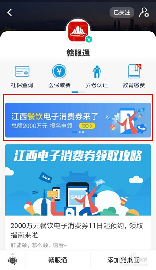 进入赣服通后,可以看到江西餐饮电子消费券的宣传信息,接着我们点击它