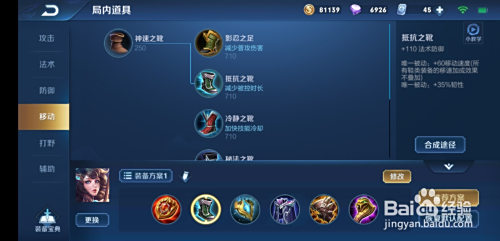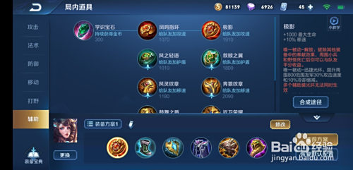 第一件装备,学时宝石,前期不进级,中后期后进级为极影,增添血量、移速,被动给队友供给攻速和冷却缩减。