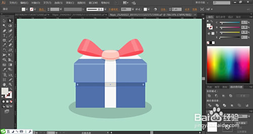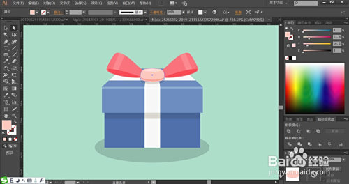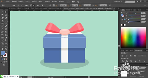 礼盒的盖子用蓝灰色填充,礼盒的本家儿体用蓝色填充,中心的包装带用白色填充。礼盒盖子下方的暗影用正片叠底的蓝色填充,礼盒盖子边缘的亮光用滤色模式的蓝色填充,最后再用黑色填充礼盒的暗影,设置透明度为20%的正片叠底模式,完当作蝴蝶结礼盒图片设计。