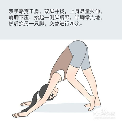 双手略宽于肩,双脚并拢,上身尽量拉伸,肩胛下压,抬起一侧脚后跟,半脚掌点地,然后换另一只脚,瓜代进行20次。