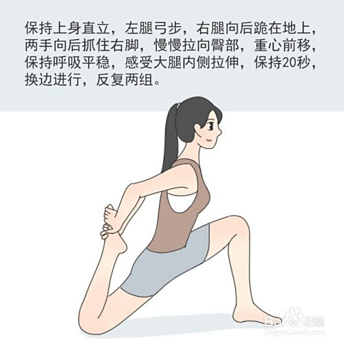 连结上身竖立,左腿弓步,右腿标的目的后跪在地上,两手标的目的后抓住右脚,慢慢拉标的目的臀部,重心前移,连结呼吸平稳,感触感染大腿内侧拉伸,连结20秒,换边进行,频频两组。
