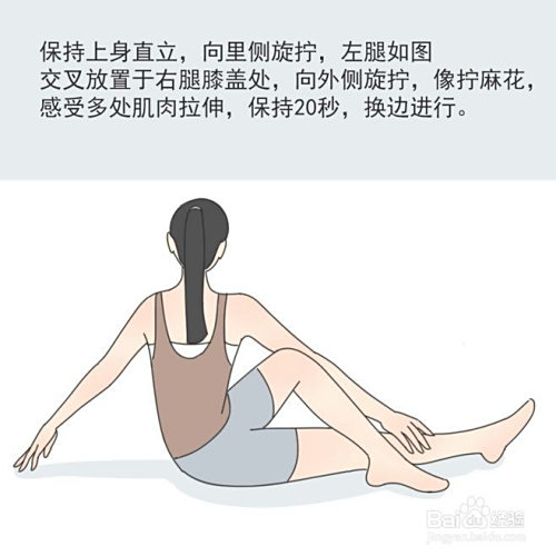 连结上身竖立,标的目的里侧旋拧,左腿如图交叉放置于右腿膝盖处,标的目的外侧旋拧,像拧麻花,感触感染多处肌肉拉伸,连结20秒,换边进行。