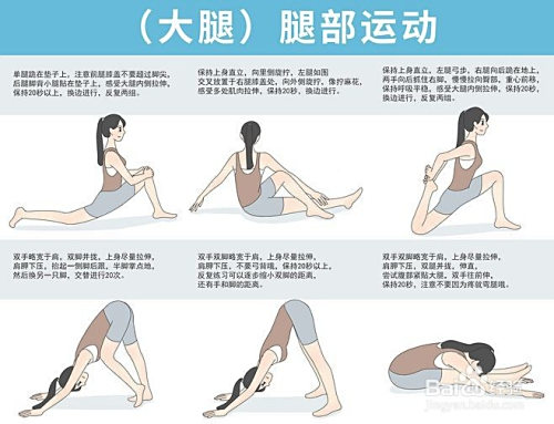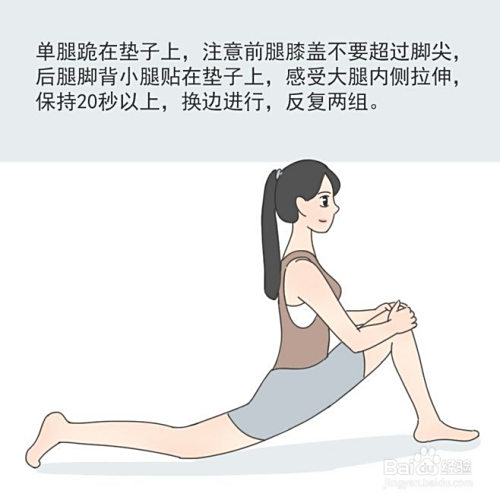 单腿跪在垫子上,注重前腿膝盖不要跨越脚尖,后腿脚背小腿贴在垫子上,感触感染大腿内侧拉伸,连结20秒以上,换边进行,频频两组。