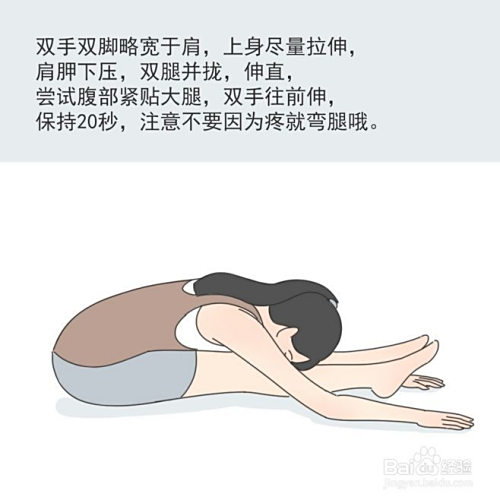 双手双脚略宽于肩,上身尽量拉伸,肩胛下压,双腿并拢,伸直,测验考试腹部津贴大腿,双手往前伸,连结20秒,注重不要因为疼就弯腿哦。