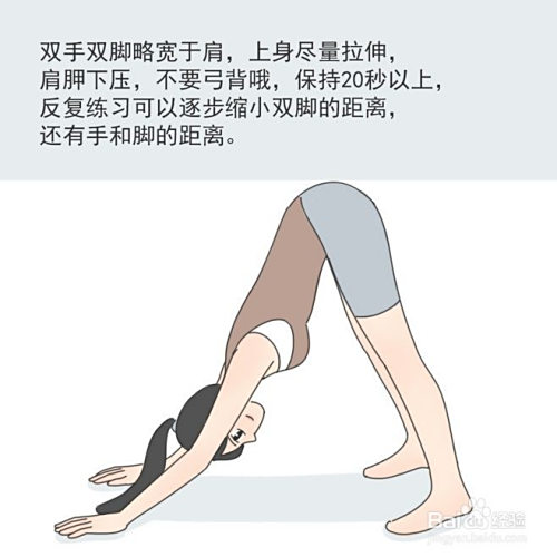 双手双脚略宽于肩,上身尽量拉伸,肩胛下压,不要弓背哦,连结20秒以上,频频操练可以慢慢缩小双脚的距离,还有手和脚的距离。