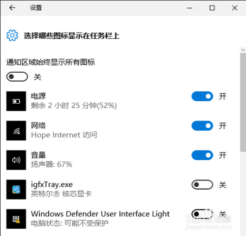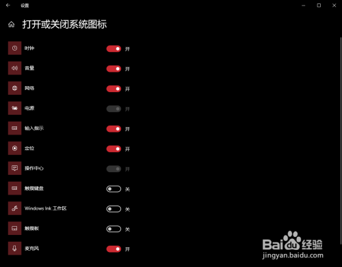 确保“音量、收集、输入指示、时钟、电源、操作中间”等系统图标设置为“开”的状况,若是是台式机,则“电源”图标为灰色不成设置状况。