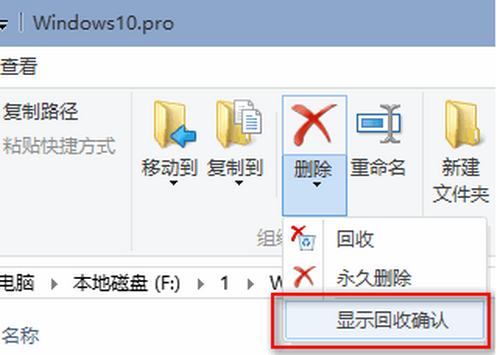 点击“删除”按钮下方的三角箭头,然后在弹出的菜单中打消勾选“显示收受接管确认”。这样再删除文件时,就不会再弹出收受接管确认对话框或永远删除确认对话框了。