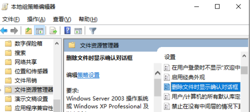 然后在右侧窗口中找到“删除文件时显示确认对话框”设置装备摆设项,双击打开设置装备摆设窗口,选择“未设置装备摆设”或“已禁用”,确定,封闭窗口。