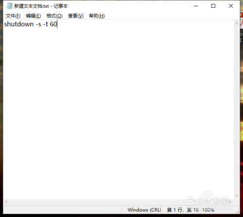 建好这个文本文档后,打开它。在里面输入代码“shutdown -s -t 60”代码中的空格不要健忘
