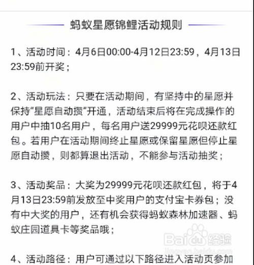 3.打开蚂蚁星愿锦鲤勾当法则,查看勾当时候,弄法和奖品。