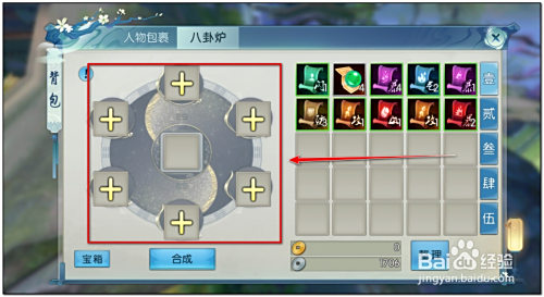 5.将获得的鲟鱼、胖头鱼、桂鱼、乌鱼各1条放进八卦炉合当作