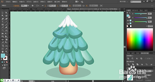 利用绿色与暗绿色搭配填充小圣诞树的本家儿体与叶片下方的曲边的圆弧路径。