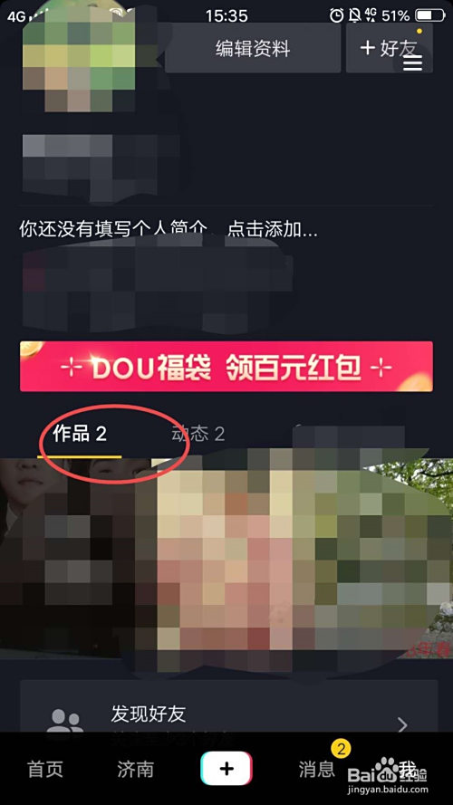然后点击【作品】,找到需要删除的视频,点击进去;