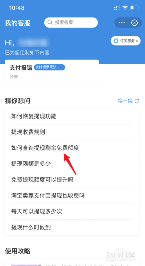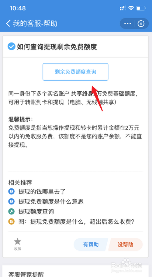 点击后,选择查询提现残剩免费额度的选项。