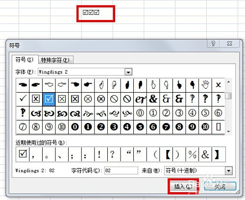 在弹窗内字体选择Wingdings 2,找到其下的打勾的方框点击插入