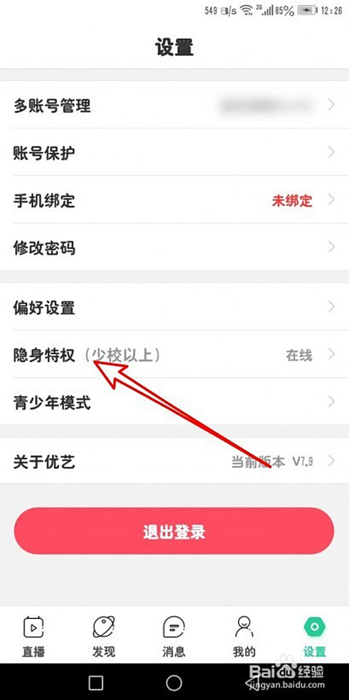 然后在打开页面,点击隐身特权的设置项。