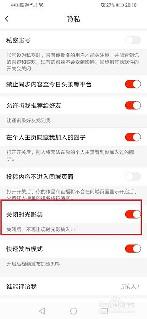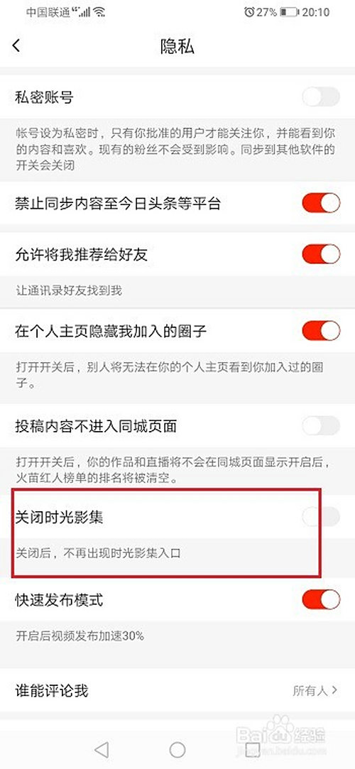 第四步进去隐私选项界面之后,可以看到封闭光阴影集选项,点击可以进行开启,如下图所示: