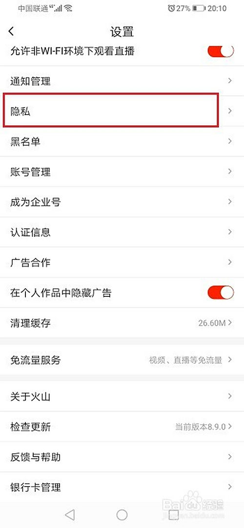 第三步在抖音火山版设置界面,点击隐私,如下图所示: