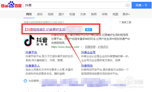 打开百度官网,搜刮“抖音”点击并进入。
