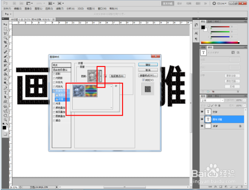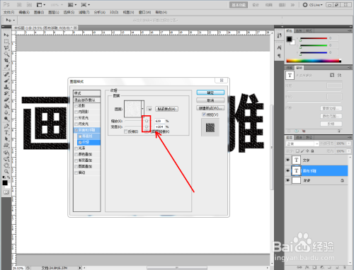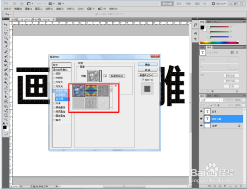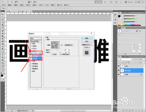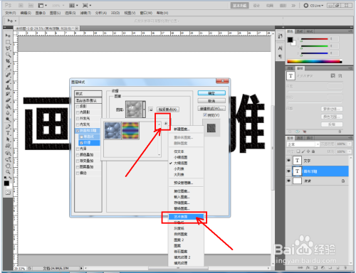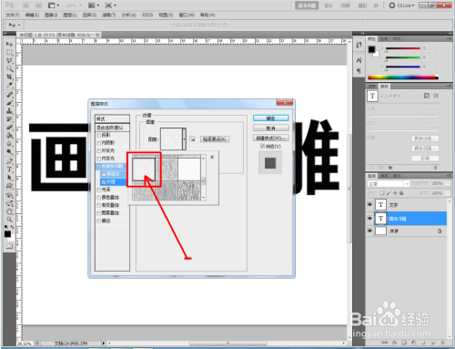 双击图示文字图层,弹出图层样式设置栏。勾选【斜面和浮雕】-【纹理】,点击图示小三角,弹出图案选项栏;