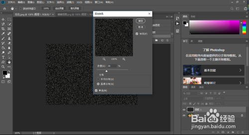 在菜单栏点击滤镜——杂色——添加杂色,设置相关参数如下:点击确定。